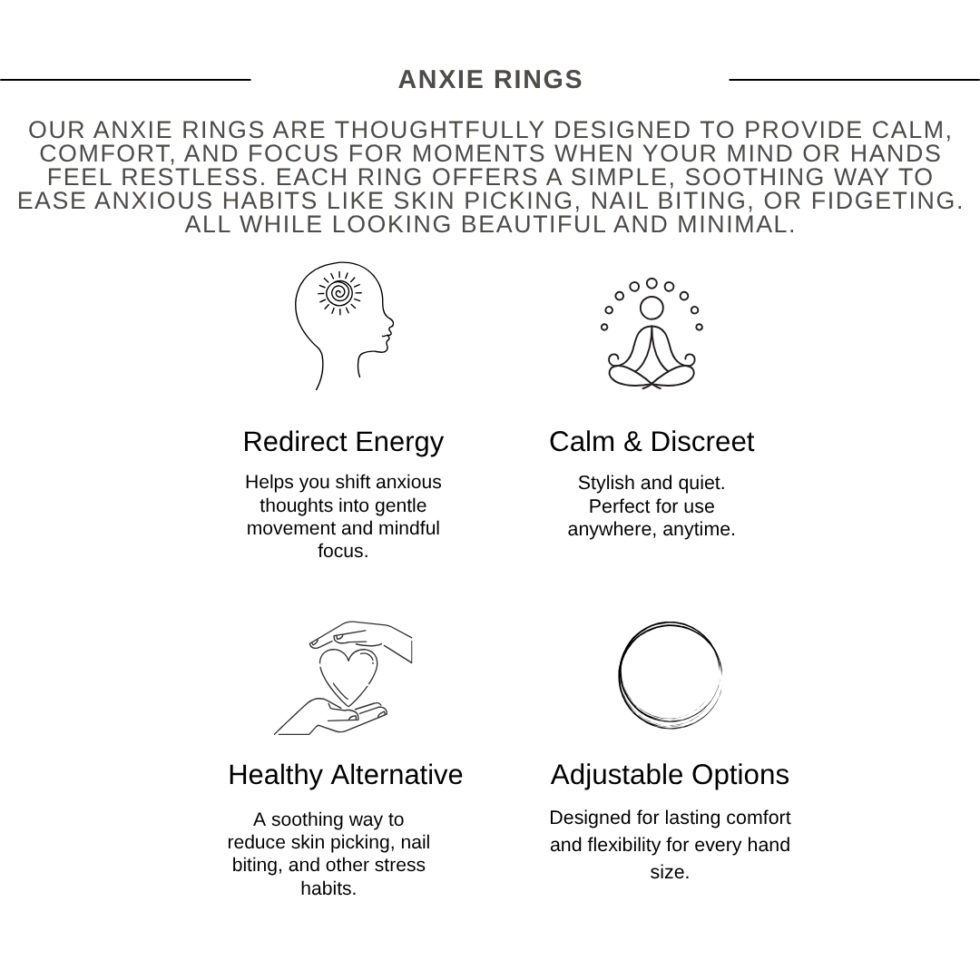 At Anxie Rings™, we create simple, stylish rings that help ease stress and anxious thoughts. Our goal is to make calming tools that actually fit your life. Something you can wear every day that looks good and helps you feel grounded.